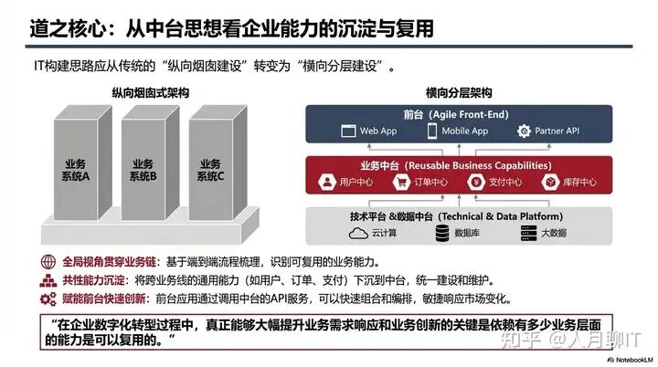 中台架构思想作为 “道” 的核心,其核心逻辑是将 IT 构建思路从传统的 “纵向烟囱建设” 转变为 “横向分层建设”。