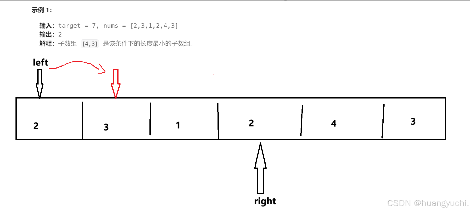 如图,当left,right找到了大于等于目标值的情况,先记录长度。然后作为暴力解法的话就是,left++,right=left+1。这里的话仔细看我们会发现没必要,当大于等于目标和时,我们只需要移动left ,然后判断移动后的结果:如果仍是大于等于目标值,记录长度,left++。如果小于目标值则移动right,知道再次遇到大于目标和的情况再次进行判断