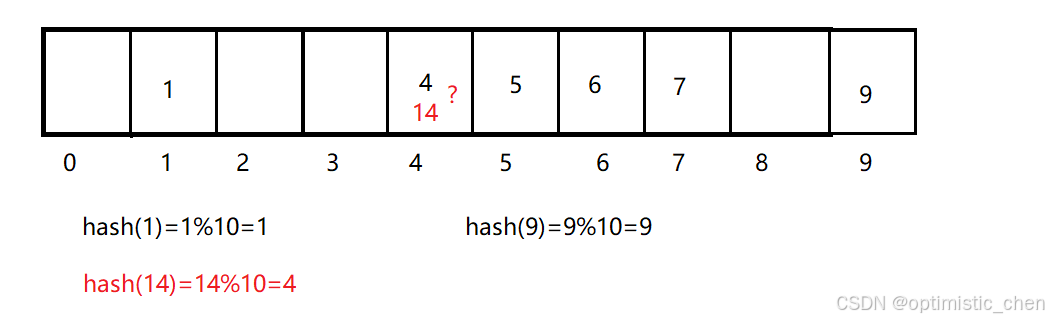 比如:前面底层数组长度为10,值域在0~9之间就不会冲突:一旦出现值域之外的值,像是14,就会出现冲突。