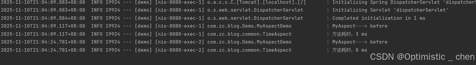 @Before):在目标方法执行之前执行@After):在目标方法执行之后执行,无论方法是否正常返回@AfterReturning):在目标方法正常返回之后执行@AfterThrowing):在目标方法抛出异常时执行@Around):围绕目标方法执行,可以在方法执行前后自定义逻辑我们通过代码来显式的观察这几种类型: