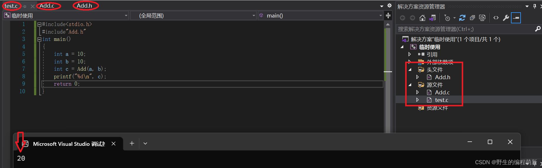 当我们写的代码数量比较多的时候,如果我们将所有的代码放在一个文件中,这会让人觉得代码冗杂,没有一点逻辑。这时候我们就要根据程序的功能,将代码拆分在多个文件中。⼀般情况下,函数的声明、类型的声明放在头⽂件(.h)中,函数的实现是放在原⽂件(.c)⽂件中。例如: