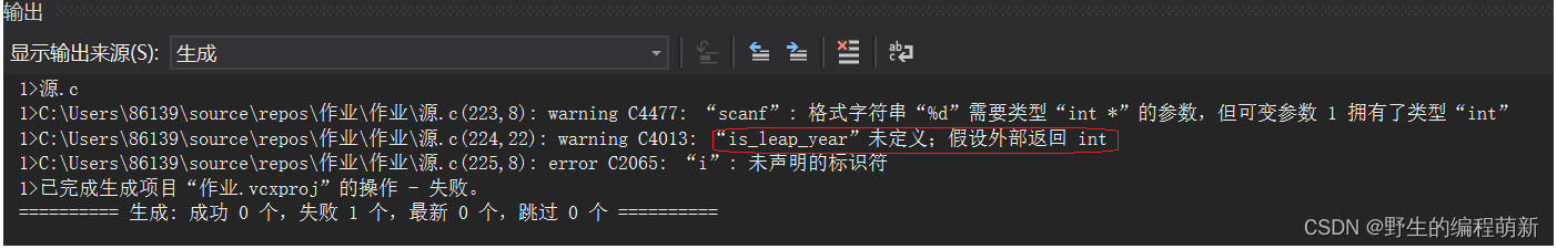 编译之后会出现上面的警告信息。这是因为C语⾔编译器对源代码进⾏编译的时候,从第⼀⾏往下扫描的,当遇到第6⾏的is_leap_year 函数调⽤的时候,并没有发现前⾯有is_leap_year的定义,就报出了上述的警告。 把怎么解决这个问题呢?就是函数调⽤之前先声明⼀下is_leap_year这个函数,声明函数只要交代清楚函数名,函数的返回类型和函数的参数。(如:int is_leap_year(int y);这就是函数声明,函数声明中参数只保留类型,省略掉名字也是可以的。)
