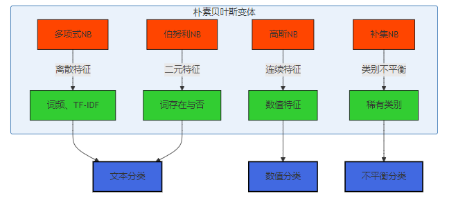 根据特征的不同分布假设,朴素贝叶斯可以分为以下几种常见变体: