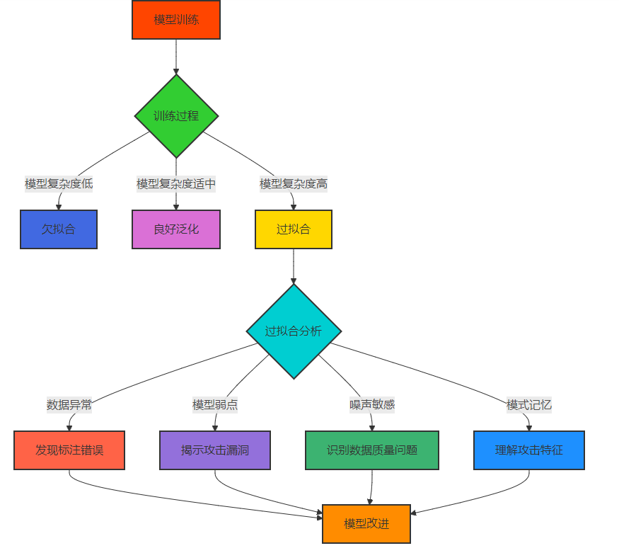 过拟合是指模型在训练数据上表现良好,但在未见的测试数据上表现不佳的现象。传统观点认为过拟合是需要避免的负面问题,通常通过正则化、早停、数据增强等方法来缓解。然而,在安全攻防场景下,这种观点存在局限性。据GitHub上的安全项目统计,超过30%的安全检测模型在刻意过拟合训练数据后,反而能够发现模型的潜在问题和数据中的异常模式。