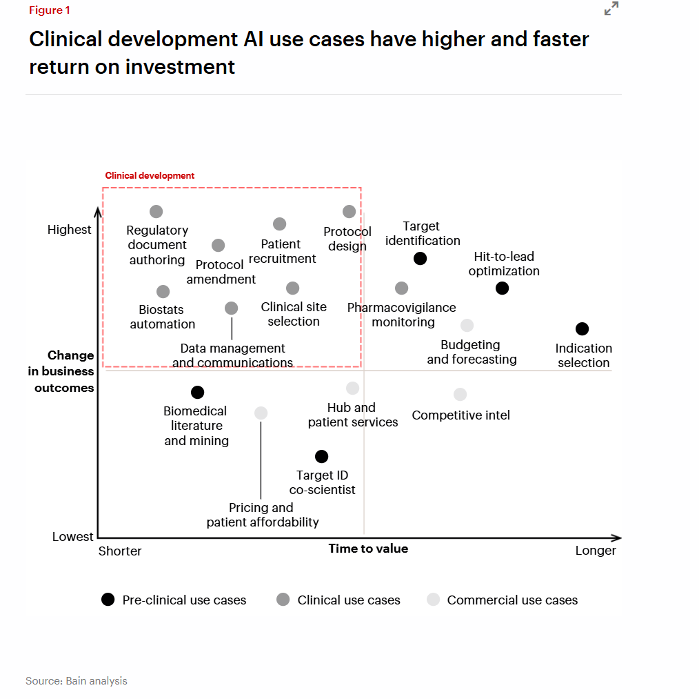 与其他领域相比,AI在临床开发中能带来更高、更快的投资回报率。