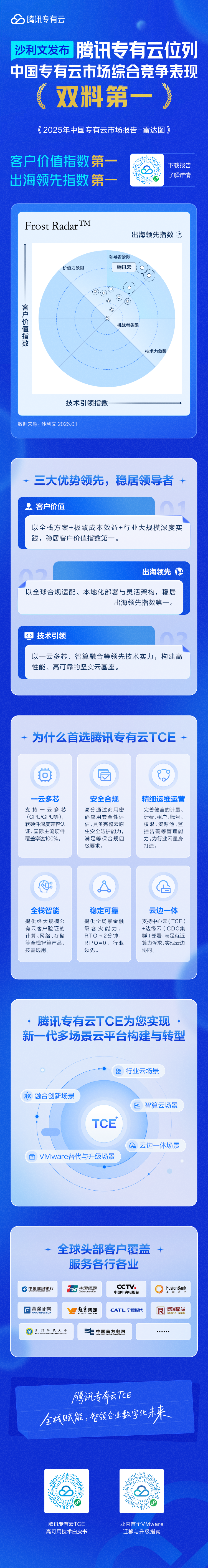 近日,国际权威调研机构弗若斯特沙利文(Frost & Sullivan)联合头豹研究院发布了《2025年中国专有云市场研究报告-雷达图》,腾讯专有云凭借领先优势脱颖而出,客户价值、出海领先两大核心评估指数位居双项第一,技术引领指数亦处前列,稳居市场领导者象限,成为中国专有云市场的标杆服务商。