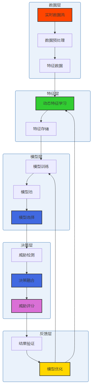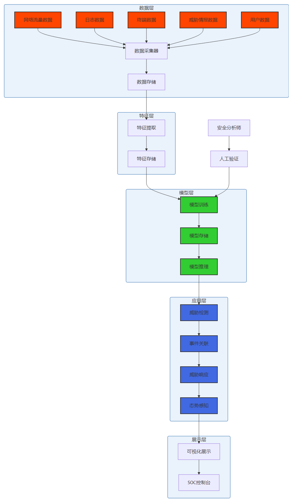 融合ML的SOC系统采用分层架构设计,包括数据层、特征层、模型层、应用层和展示层: