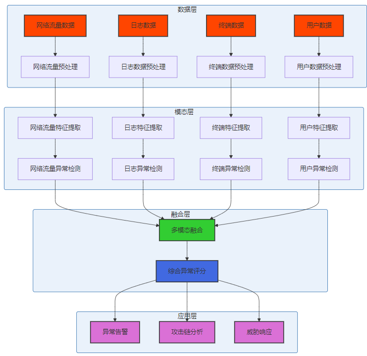 传统的异常检测方法主要基于单一数据源,如网络流量或日志数据。多模态异常行为分析融合多种数据源,能够更全面地检测异常行为:
