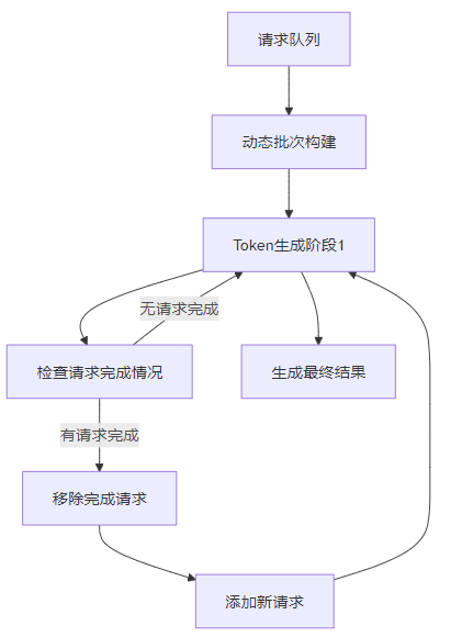 Continuous Batching技术将请求处理分为多个阶段,每个阶段处理一个Token。当一个请求生成完所有Token后,系统会立即将其从批次中移除,并加入新的请求。这种设计使得GPU资源能够被充分利用。
