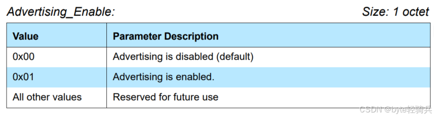 HCI_LE_Set_Advertising_Enable 命令的主要功能是控制BLE设备的广播状态。当设备需要被发现或广播某些信息时,主机(Host)会通过发送此命令并设置相应的参数来启用广播。相反,当设备不再需要广播时,主机可以发送此命令并禁用广播功能。