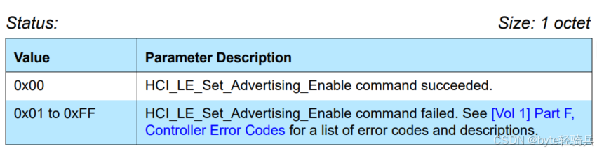 HCI_LE_Set_Advertising_Enable命令执行后,会返回一个Status参数,用于指示命令的执行结果。在应用开发中,需要仔细处理这个参数,并根据其值来执行相应的操作或错误处理流程。