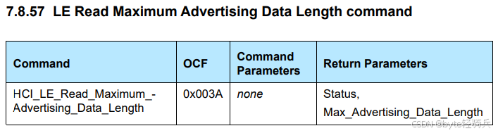 HCI_LE_Read_Maximum_Advertising_Data_Length 命令的格式通常遵循蓝牙核心规范中定义的HCI命令结构。