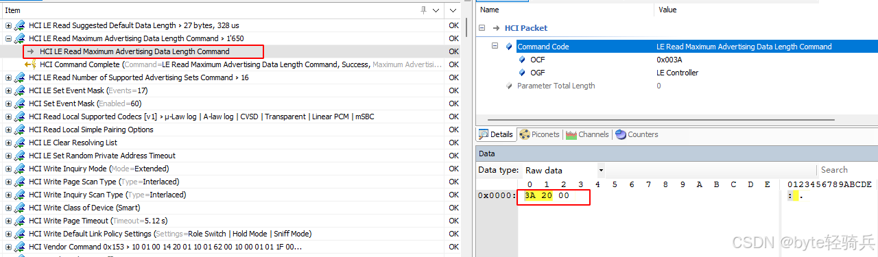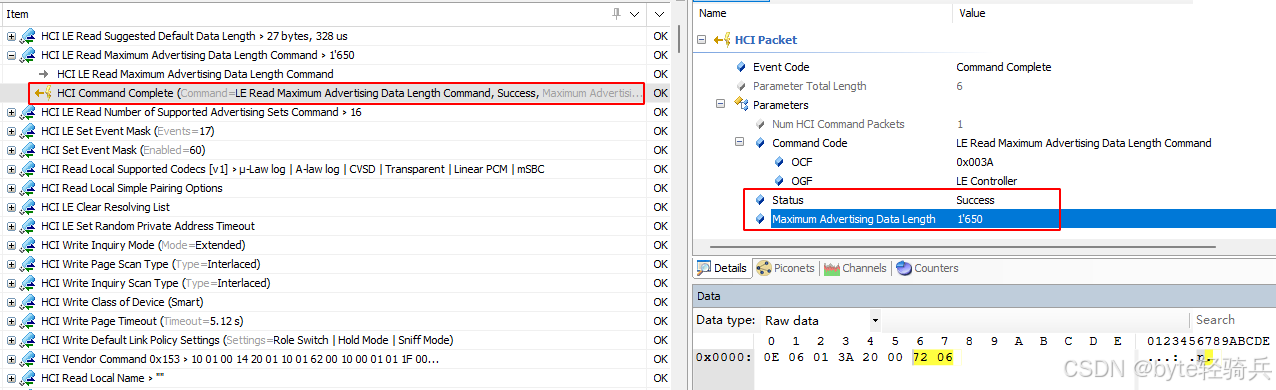 HCI_LE_Read_Maximum_Advertising_Data_Length 是一个低功耗蓝牙(Bluetooth Low Energy, BLE)的HCI( Host Controller Interface ) 命令,用于读取设备支持的最大广播数据长度。该命令是蓝牙核心规范的一部分,并在蓝牙 5.0 及更高版本中引入。广播数据长度在蓝牙广播过程中非常关键,因为它决定了设备在单次广播事件中能够发送的信息量。