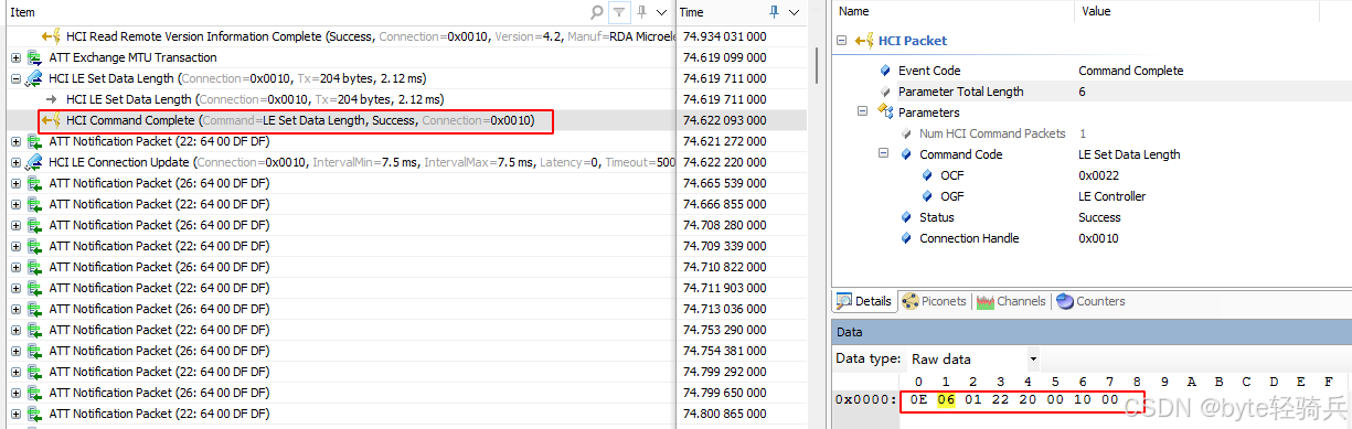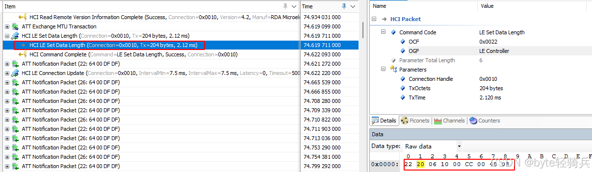 HCI_LE_Set_Data_Length命令,OCF为0x0022,用于指示该命令的功能。HCI_LE_Set_Data_Length命令,这个长度是固定的,通常为6字节(不包括OGF和OCF)。以下是一个HCI_LE_Set_Data_Length命令的示例格式: