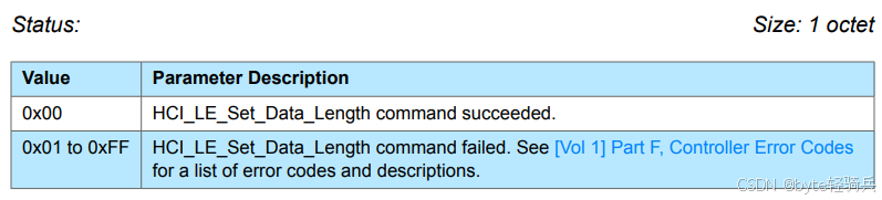 0x00:表示HCI_LE_Set_Data_Length命令成功执行,即控制器已经按照主机的要求成功设置了数据长度相关参数(如发送数据长度和接收数据长度等)。0x01至0xFF之间:表示命令执行出现了问题,不同的非零值对应着不同类型的错误原因,例如可能是参数不合法(如设置的数据长度超出了控制器的支持范围)、控制器繁忙无法处理设置请求或者设备出现故障等。主机需要根据具体的错误码来进行相应的错误排查和处理。蓝牙Controller错误代码全面概览_rejected due to limited resource-CSDN博客在HCI_LE_Set_Data_Length命令的返回参数中,Connection_Handle是用于唯一标识蓝牙设备之间连接的一个值。它就像是一个连接的 “身份证号码”,在蓝牙通信系统的众多连接中,能够准确地区分不同的连接。这个参数可以帮助主机和控制器明确数据长度设置操作是针对哪一个具体的连接进行的。
