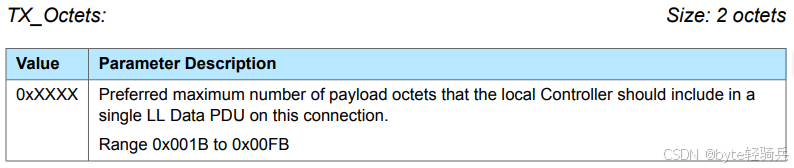 这个范围定义了BLE设备在单个LL Data PDU中可以发送或接收的最大数据量。需要注意的是,这个参数是一个优选值,实际发送或接收的数据量可能会受到多种因素的影响,如BLE控制器的实现、连接间隔、其他设备的干扰等。