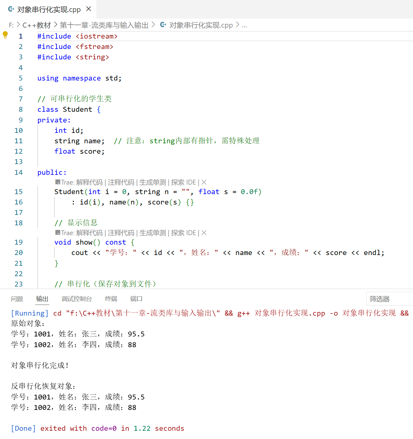 } 对象串行化(Serialization)是将对象状态转换为可存储或传输的格式(如二进制)的过程,便于对象持久化或网络传输。C++ 中可通过write()和read()实现简单的对象串行化。