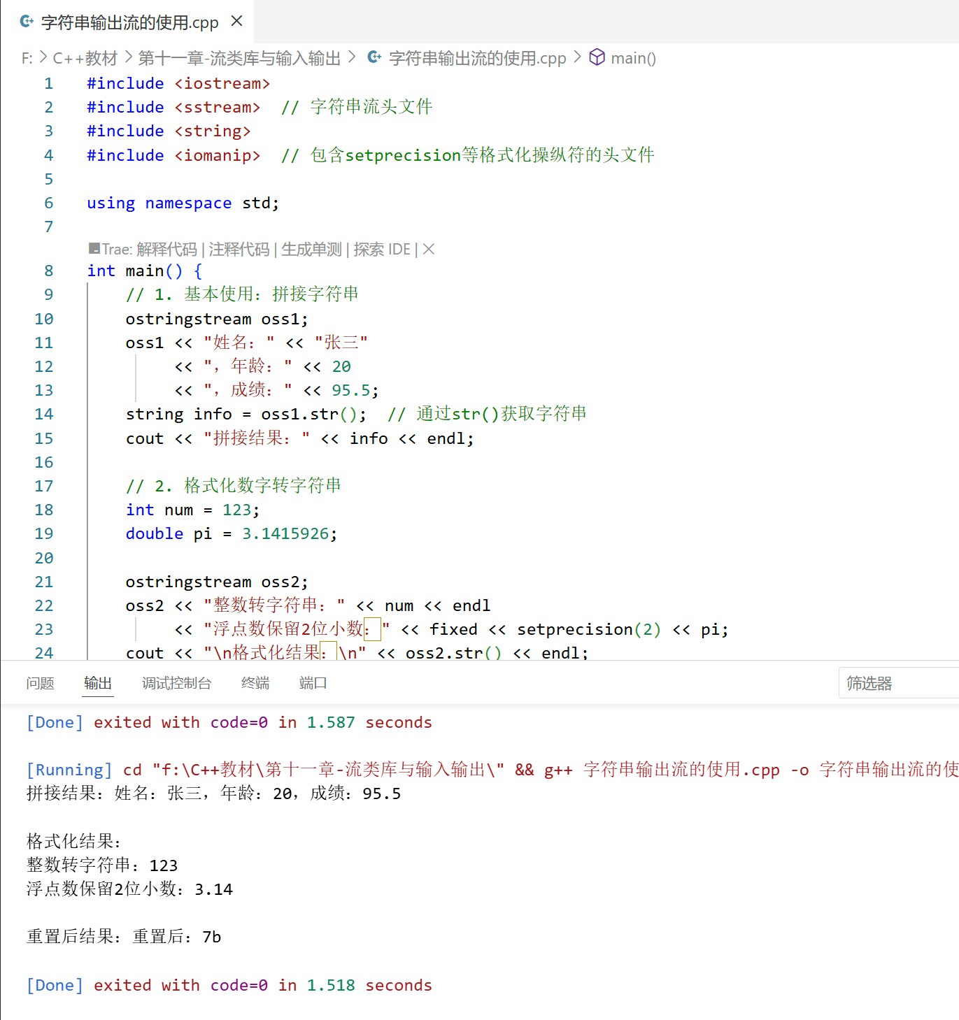 输出流用于将程序中的数据传输到外部设备(屏幕、文件等),C++ 中最常用的输出流是cout(控制台输出)、ofstream(文件输出)和ostringstream(字符串输出)。