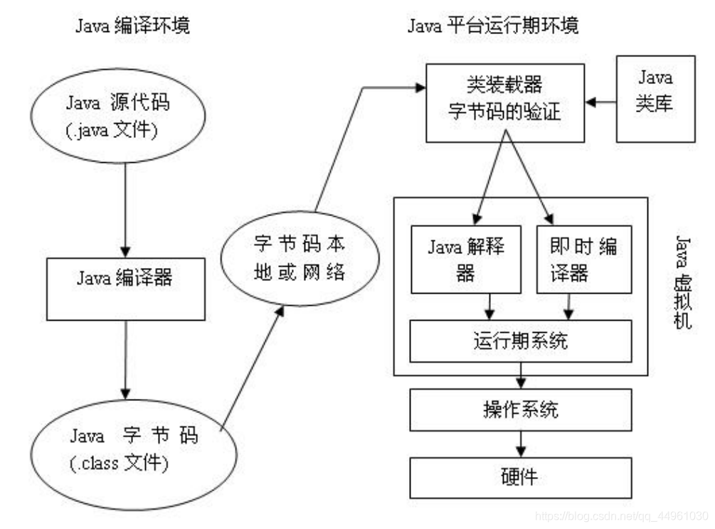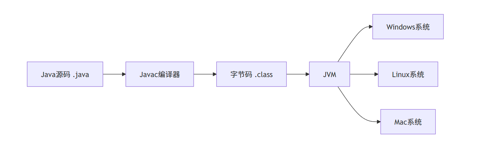 .java →(编译)→ .class字节码 →(JVM解释执行)→ 机器码