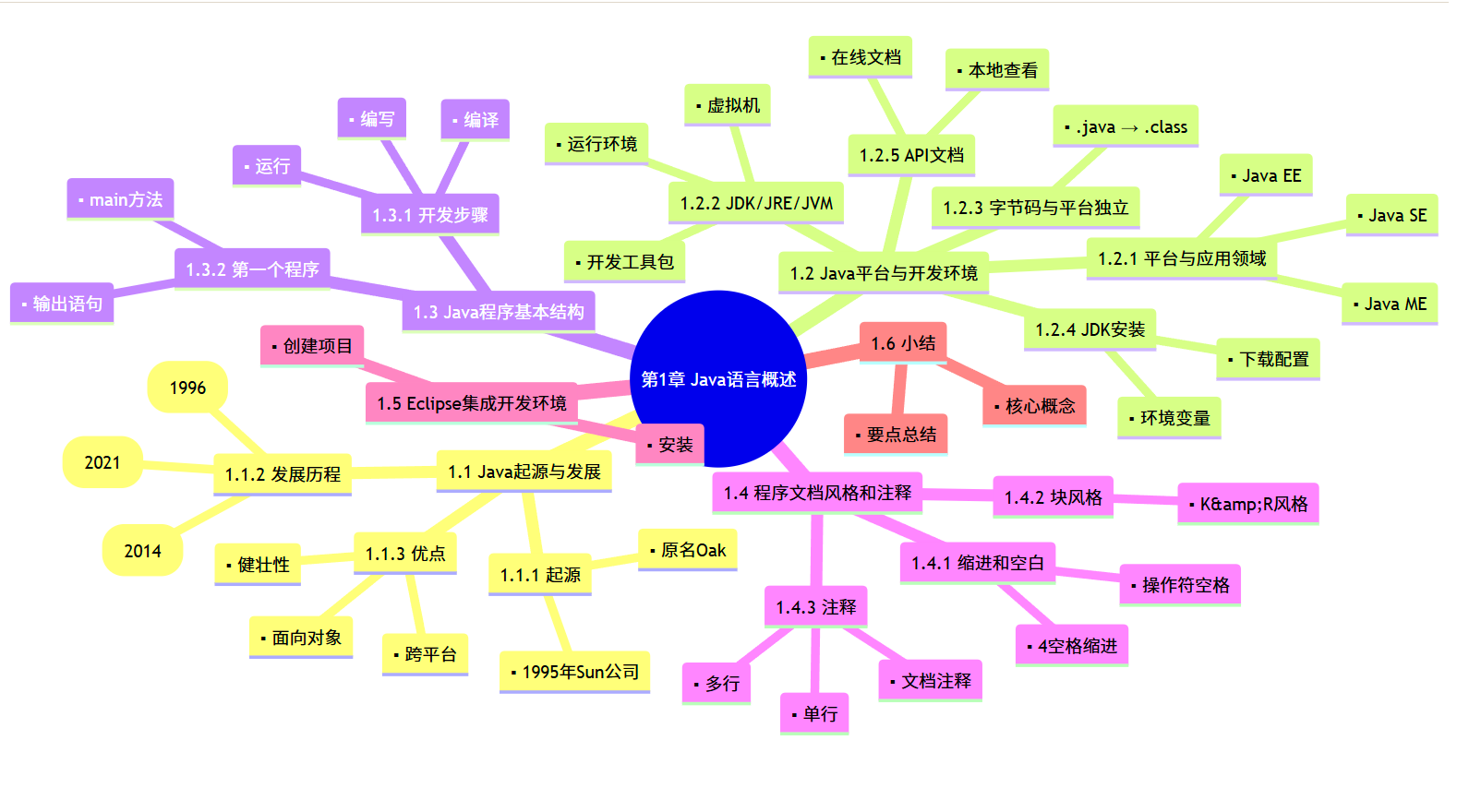 1.1.1 Java的起源 1995年由Sun公司(现Oracle)发布,最初命名为Oak,专为嵌入式设备设计。后因互联网兴起转型为Web开发语言,并改名Java。