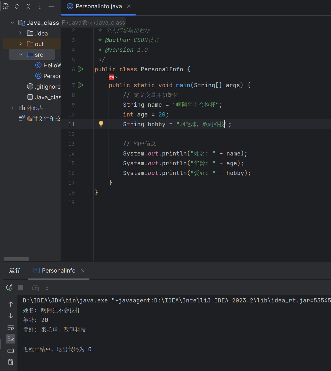 题目:编写程序输出个人信息(姓名、年龄、爱好),要求: