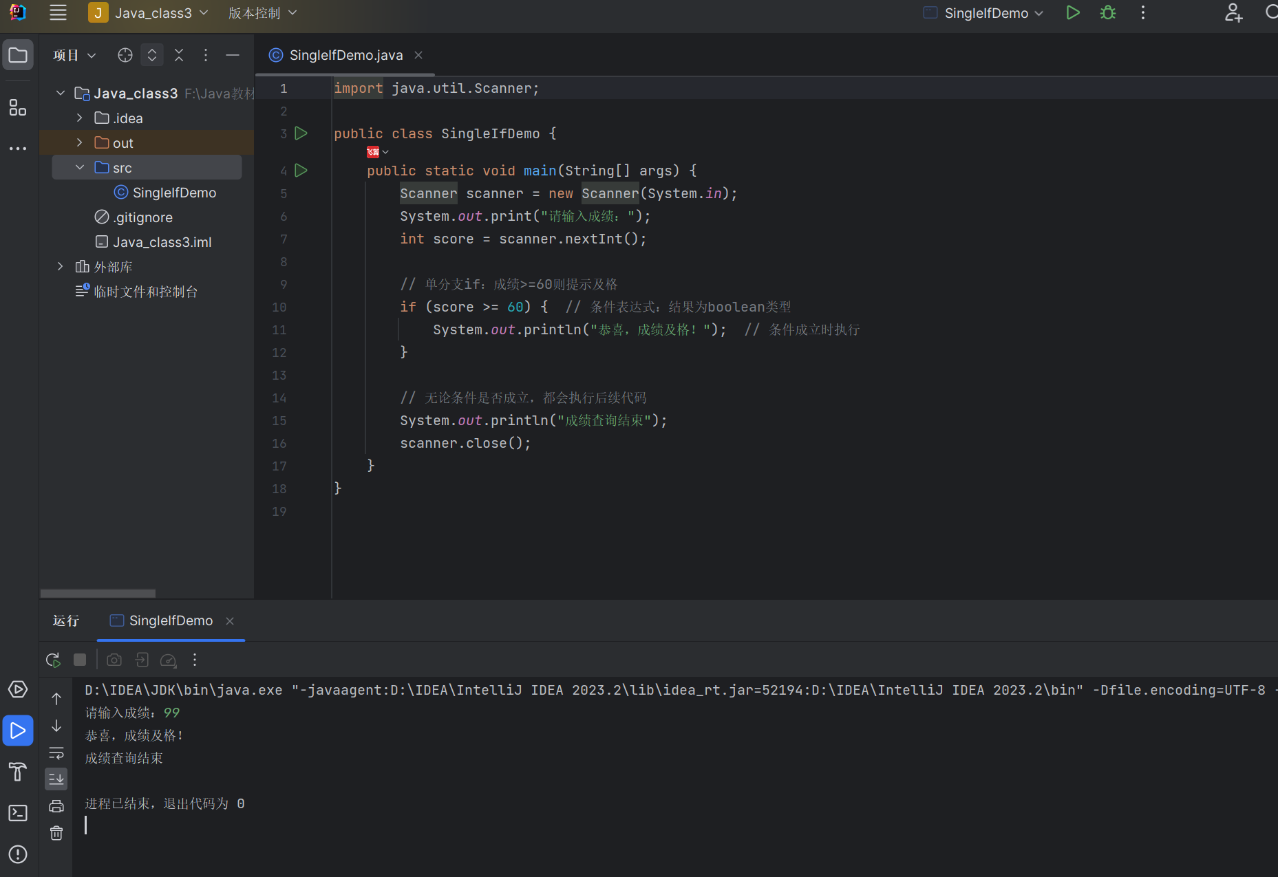 System.out.println("恭喜,成绩及格!"); // 条件成立时执行