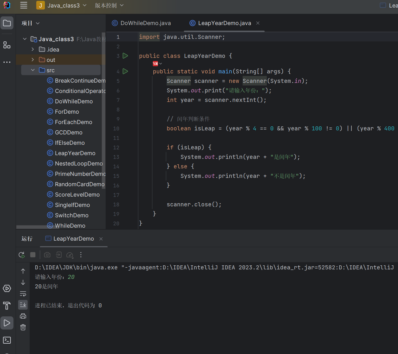 if适合范围判断,switch适合多值匹配for适合次数明确场景,while/do-while适合条件控制场景需求:输入年份,判断该年是否为闰年(能被 4 整除且不能被 100 整除,或能被 400 整除)。