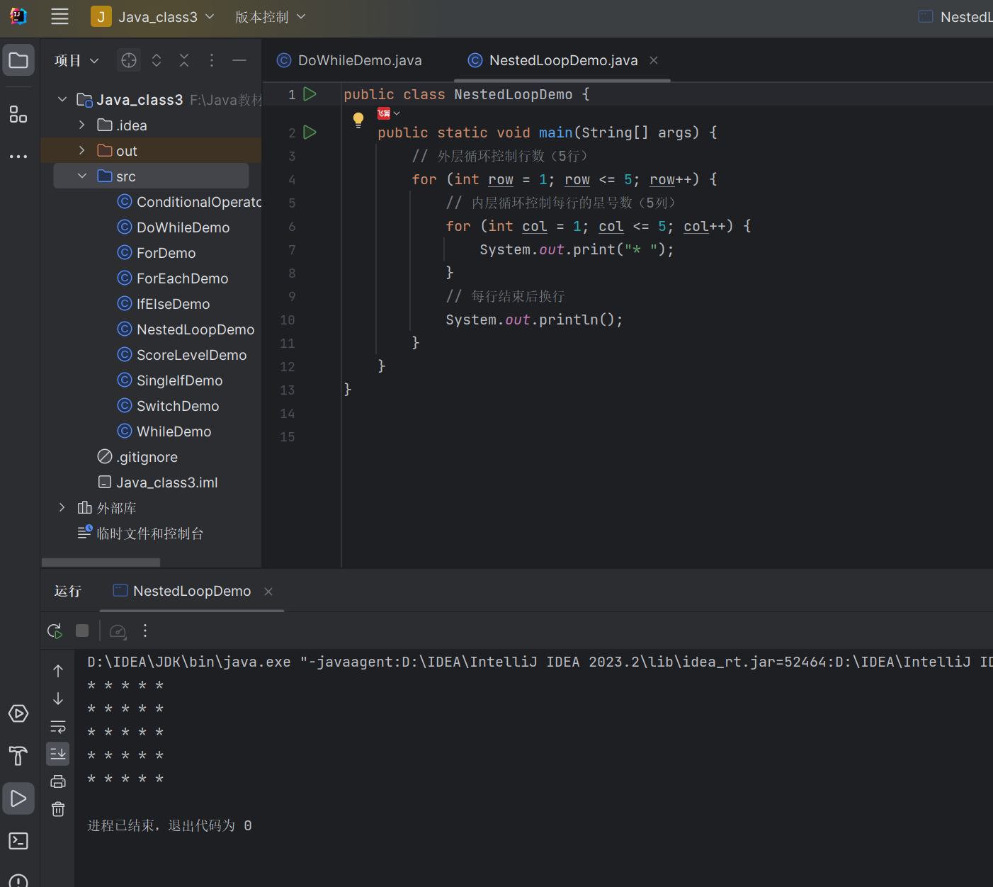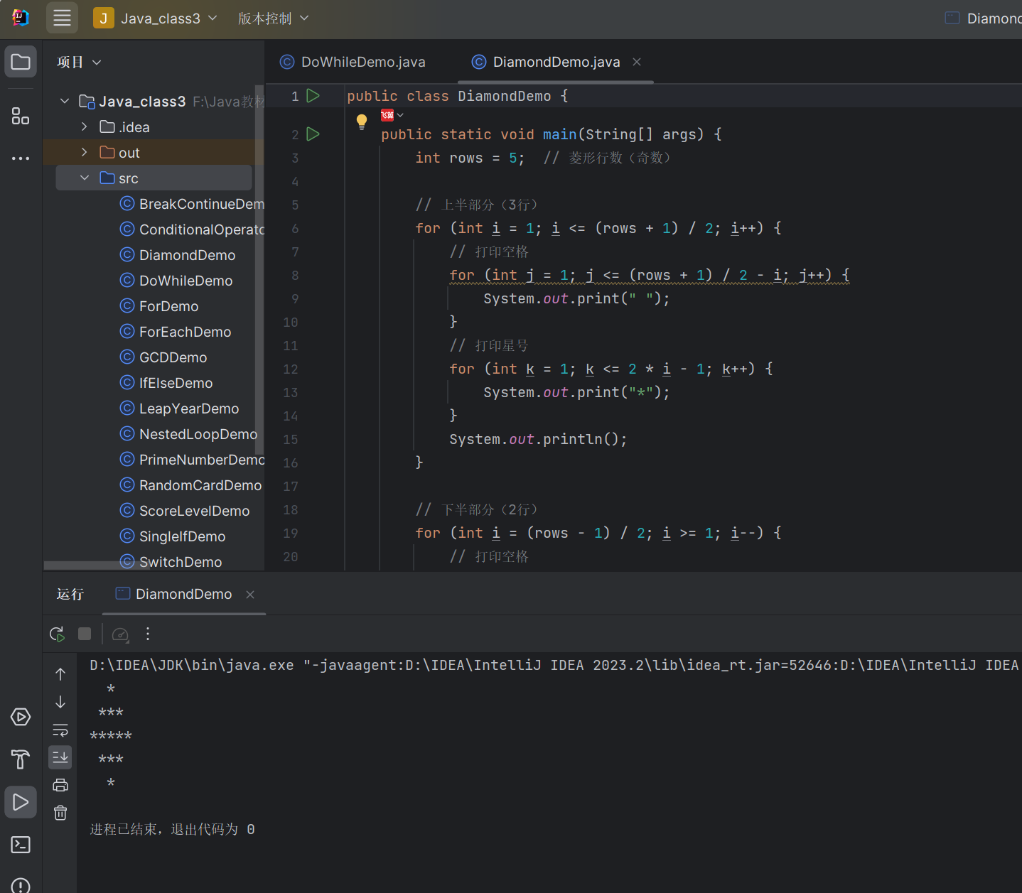 需求:使用循环嵌套打印 5 行菱形(由星号组成)。