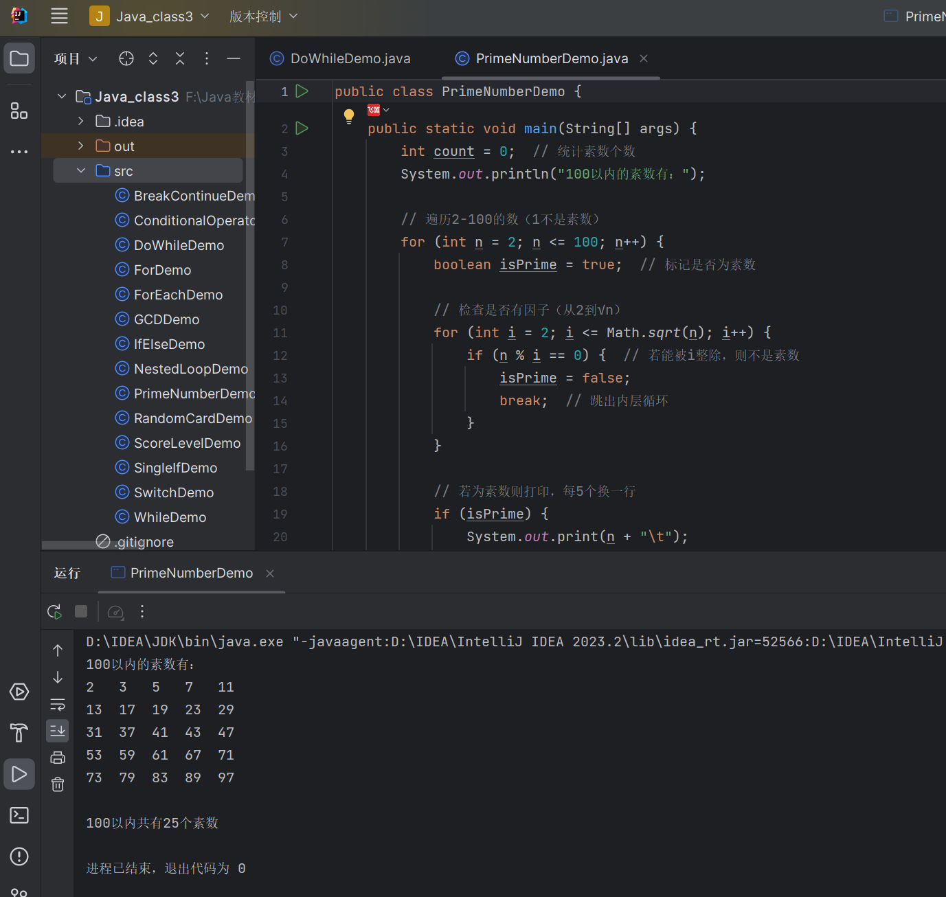 关键技术:循环嵌套、素数判断算法、break优化循环效率。