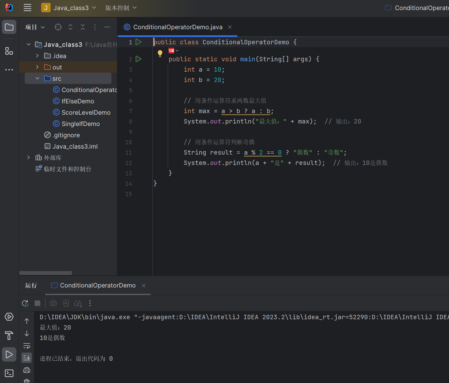 结果变量 = 条件表达式 ? 表达式1 : 表达式2;true,结果为表达式 1 的值;否则为表达式 2 的值示例代码: