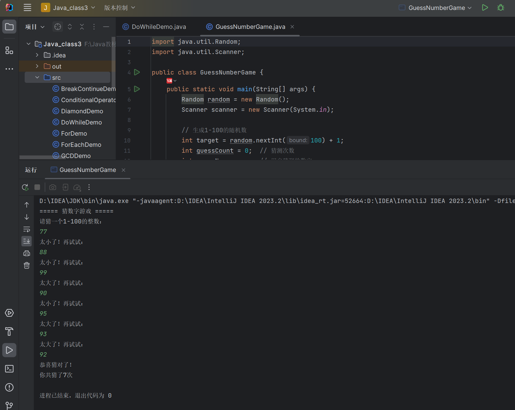 需求:程序随机生成 1-100 的整数,用户反复猜测,程序提示 “太大” 或 “太小”,直到猜对为止,统计猜测次数。