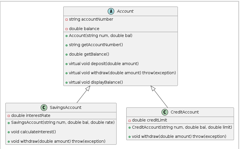 CreditAccount(string num, double bal, double limit) : Account(num, bal), creditLimit(limit) {}