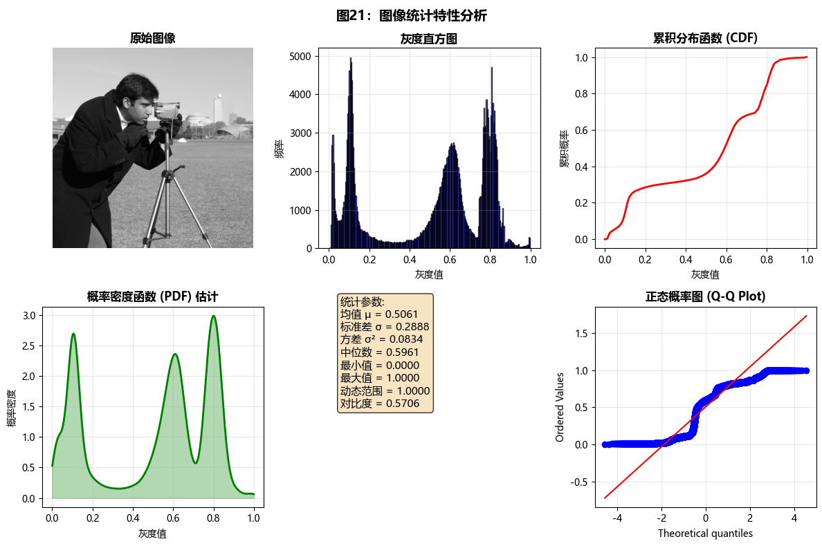 plt.suptitle('图21:图像统计特性分析', fontsize=14, fontweight='bold', y=0.98)