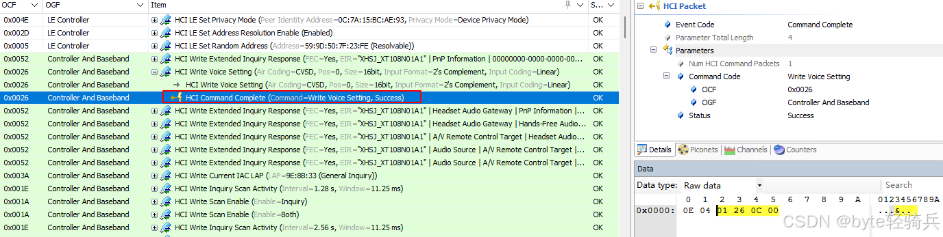 HCI_Write_Voice_Setting命令成功执行。这表示所请求的语音设置已成功应用于当前的蓝牙连接。