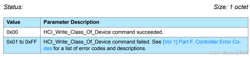 HCI_Command_Complete事件,其值通常为0x0E。HCI_Write_Class_Of_Device命令,其完成参数通常包括: Status用于指示命令是否成功执行。