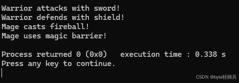void defend() override { std::cout << "Mage uses magic barrier!" << std::endl; }