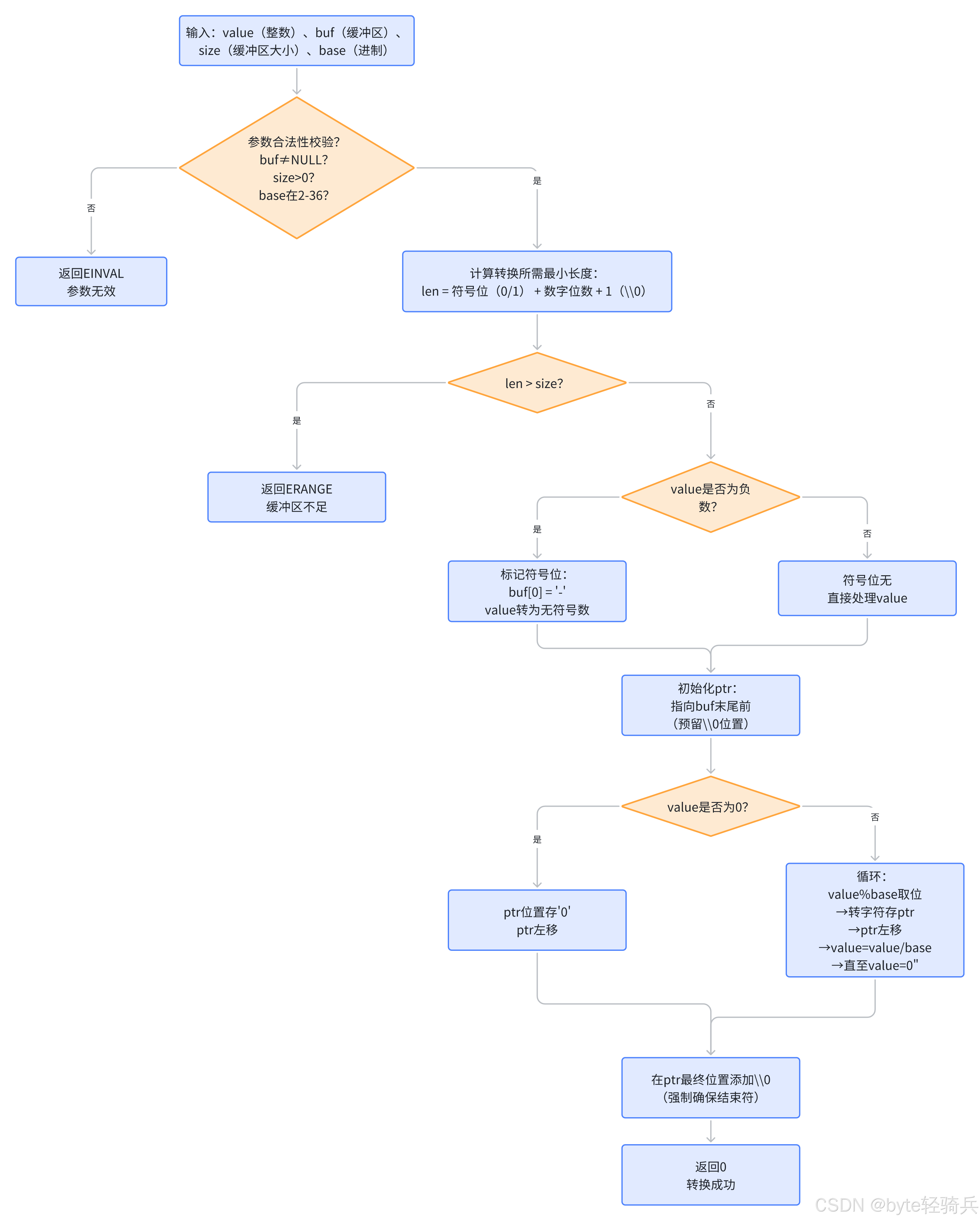 itoa_s()的实现逻辑在itoa基础上,新增了三层安全防护:参数合法性校验、缓冲区大小预检查、错误码反馈。以下是符合 C11 安全标准的伪代码实现与流程解析。