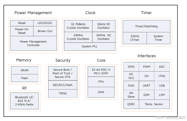 在本心电产品方案中,我们选用泰凌微电子 TL721X 作为主控芯片。这款芯片专为便携式医疗场景设计,凭借高能效架构与精准信号处理能力,成为心电监测设备的核心控制单元。其采用 RISC-V 架构,工作电流低至 1mA 量级,配合多级电源管理机制(支持深度休眠 / 唤醒模式),可将设备续航延长 30% 以上,完美匹配可穿戴心电设备的低功耗需。