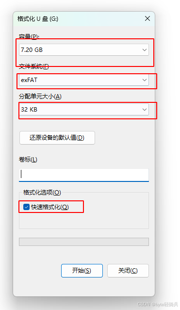 ③ 点击 "开始",等待格式化完成(约 8 秒),系统提示 "格式化完毕" 后关闭窗口