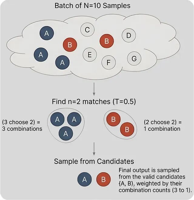核心创新点在于:不需要概率值也能做温度控制。方法是把概率重加权 P(x)ⁿ 转化成一个采样事件——只在n个独立抽样碰撞到同一结果时接受。