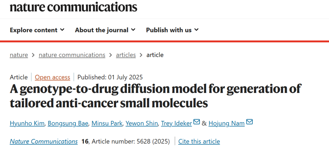 参考文献:Kim, H., Bae, B., Park, M. et al. A genotype-to-drug diffusion model for generation of tailored anti-cancer small molecules. Nat Commun 16, 5628 (2025). https://doi.org/10.1038/s41467-025-60763-9