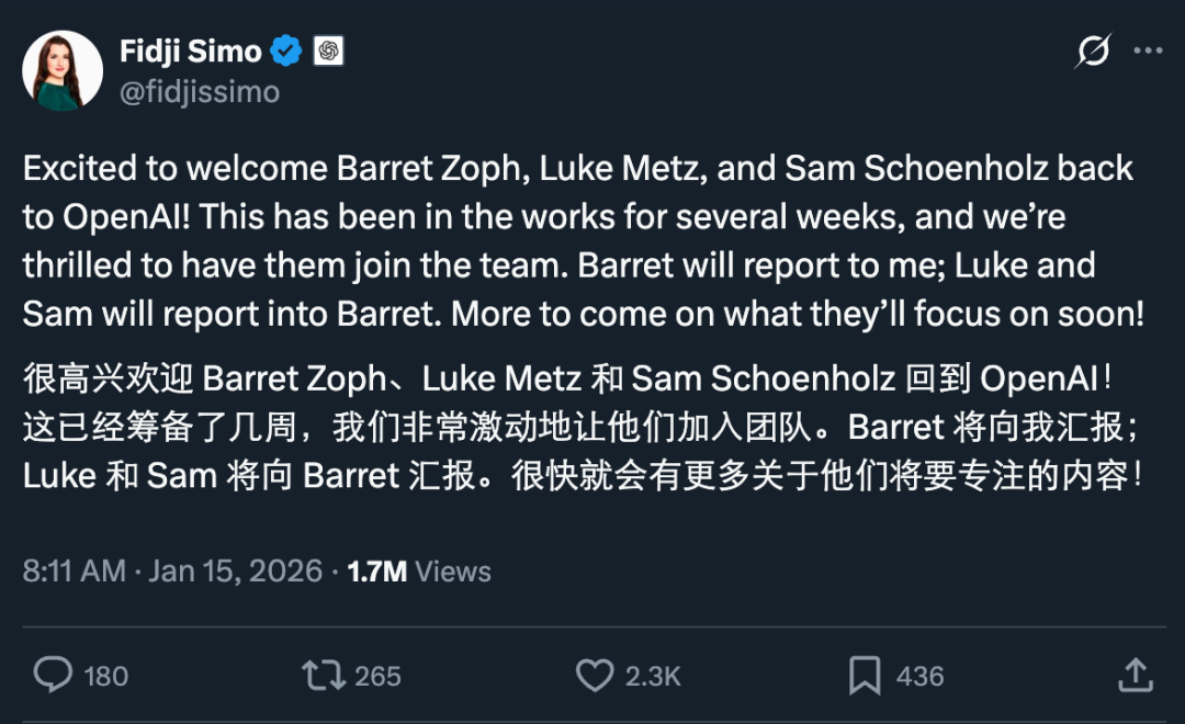 昨天,我们报道了前 OpenAI CTO Mira Murati 创办的 Thinking Machines Lab 出现重大人事变动的消息:联合创始人兼 CTO Barret Zoph 被解雇,另一位联创 Luke Metz 以及创始团队成员 Sam Schoenholz 也一起离开,三人一起回归 OpenAI。