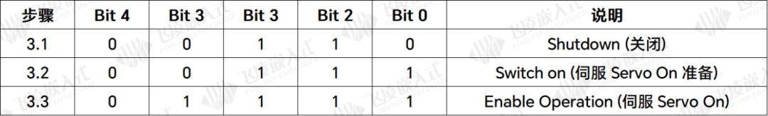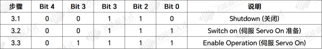 步骤3:设定控制指令,OD 6040h,请依照以下步骤操作。步骤 3.1 与 3.2 是为了使驱动器的状态机 (state machine) 进入准备状态。