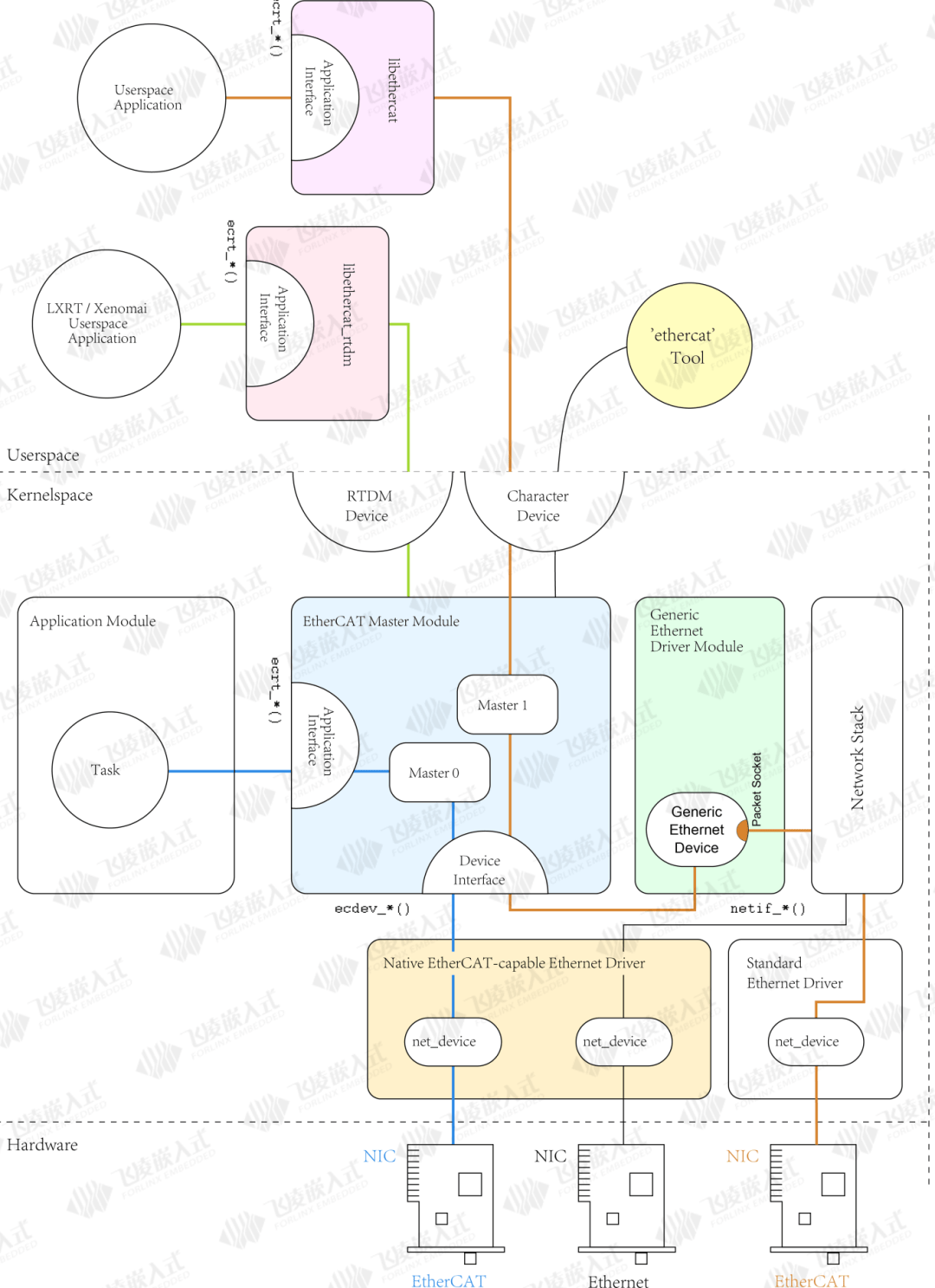 IgH EtherCAT则是运行于Linux系统的开源EtherCAT主站程序,IgH EtherCAT主站通过构建Linux字符设备,应用程序通过对字符设备的访问实现与EtherCAT主站模块的通信。