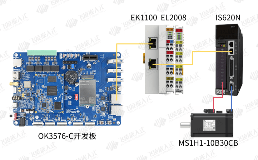 主站通过网线连接EtherCAT耦合器EK1100,EK1100通过E-Bus连接数字量输出模块EL2008、通过网线连接伺服驱动器IS620N,交流伺服电机MS1H1-10B30CB通过动力线和编码线与伺服驱动器IS620N相连。