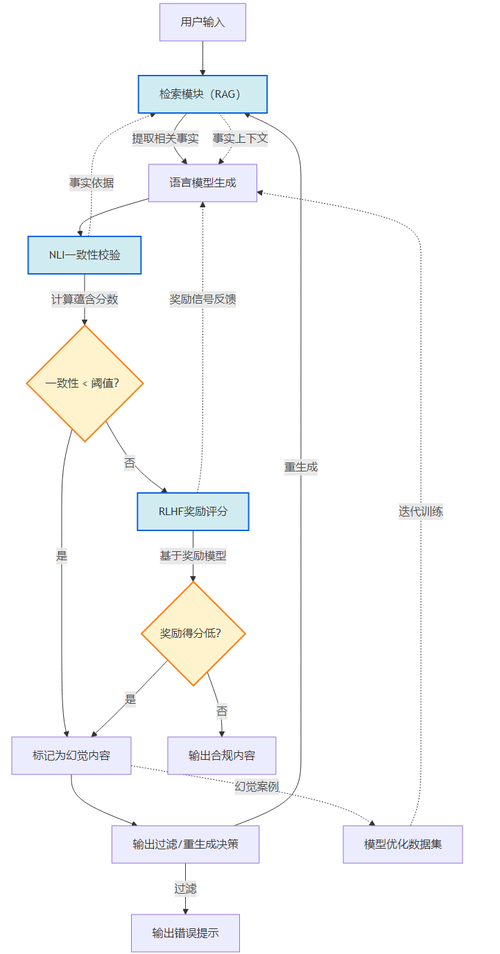 以下采用Mermaid语法绘制综合流程图,涵盖从用户输入到最终输出的全链路,标注关键判断节点与数据流向,清晰呈现幻觉抑制与RLHF对齐的协同机制。