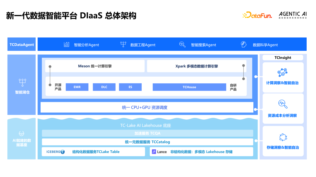 DIaaS 的关键组件包括统一多模态智能数据湖 TCLake、多模态统一计算引擎 Meson、数据分析智能体 TCDataAgent、平台智能管家服务 TCInsight,以及面向超大规模 CPU+GPU 一体化平台集群的统一资源调度服务。在自然语言交互能力上,TCDataAgent 的 NL2SQL 能力在 BIRD-Bench 评测中取得 75.74 分,跻身全球前三、国内第一。
