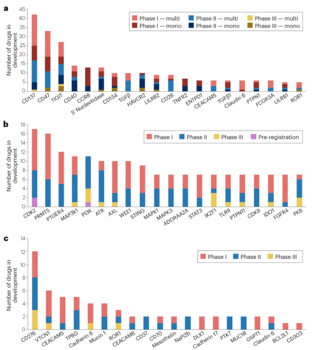 在不同新型靶点之间,研发资源的分布并不均衡。“Me Too”现象,即多家生物制药公司围绕同一靶点同时开发相似药物,往往在该靶点的任何药物首次获批之前就已出现。例如,目前共有42个以抗体为基础、靶向CD137(亦称4-1BB)的候选药物正处于Ⅰ–Ⅲ期临床开发阶段(图2a)。CD137是一种表达于活化免疫细胞表面的共刺激分子。这些候选药物包括12个单克隆抗体(mAb)以及30个多特异性抗体候选物。双特异抗体以及新型靶点组合(通常为一个已确立靶点与一个新型靶点)的开发,使得同时作用于两条通路产生协同疗效成为可能。例如阿米万妥单抗(amivantamab)对EGFR与MET的联合抑制,或通过GPRC5D×CD3双特异抗体他奎妥单抗(talquetamab)将癌细胞与T细胞连接在一起。