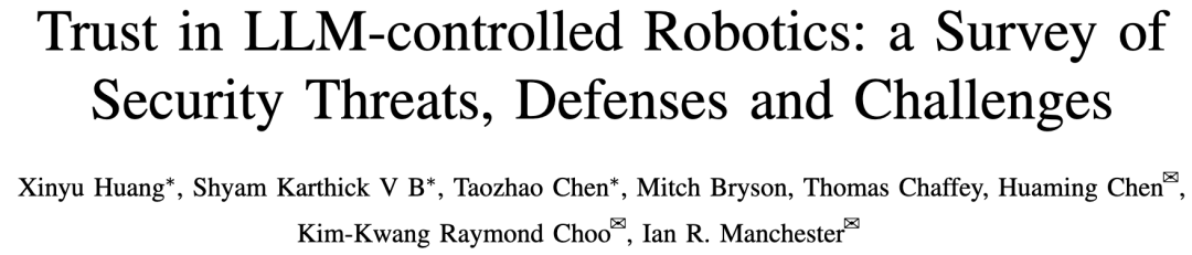 最近,悉尼大学和德克萨斯大学圣安东尼奥分校联合发表了最新系统性综述 ,首次深入探讨了 LLM 控制下机器人的安全威胁、防御机制及未来挑战。