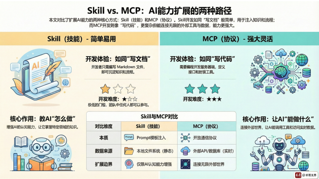 Skill教AI"怎么想",MCP让AI"能做到"